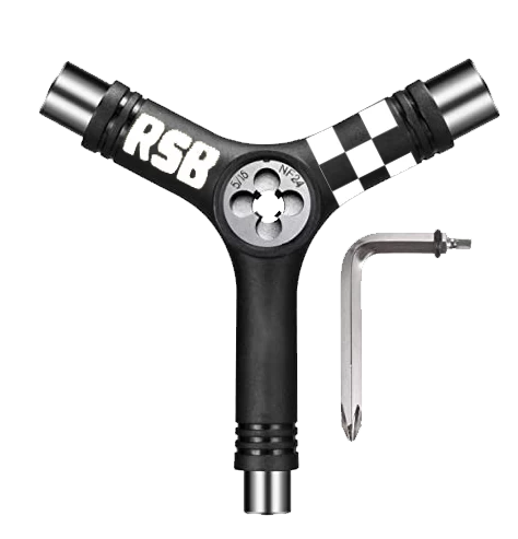 Das Rock Star Bearings Y Tool ist ein Multifunktionswerkzeug mit integriertem Inbus / Kreuzschlüssel und zustäzlich drei Nutsgrößen für Kingpin- , Achsen- und Montagemutter. Das Rock Star Tool kommt zusätzlich mit einem Gewindeschneider für den Achsstift an und ist somit das All-Round Tool von Rock Star Bearings.